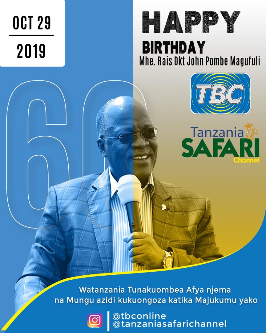 Mkurugenzi Mkuu wa Shirika la Utangazaji Tanzania – TBC Dkt. Ayub Rioba na wafanyakazi wote tunatoa pongezi zetu za dhati kwa Rais wa Jamhuri ya Muungano wa Tanzania Dkt. John Pombe Magufuli kwa kutimiza miaka 60.