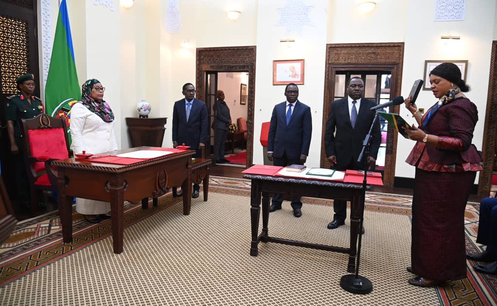 Rais Samia Suluhu Hassan akimuapisha Jenista Mhagama kuwa Waziri wa Nchi, Ofisi ya Waziri Mkuu Sera, Bunge na Uratibu kwenye hafla fupi iliyofanyika Ikulu, Dar es Salaam leo Aprili 02, 2023.Rais Samia Suluhu Hassan akimuapisha George Simbachawene kuwa Waziri wa Nchi, Ofisi ya Rais Menejimenti ya Utumishi wa Umma na Utawala Bora leo Aprili 02, 2023.