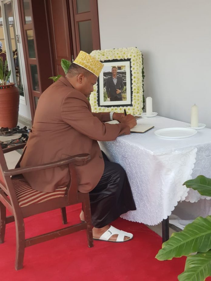 Sheikh wa mkoa wa Dar es salaam Alhad Mussa Salum akisaini kitabu cha maombolezo nyumbani kwa Mkuu wa Majeshi ya Ulinzi Venance Mabeyo jijini Dar es salaam, kufuatia kifo cha mtoto wake Nelson, ambaye ni Rubani aliyefariki Dunia hii leo katika ajali ya ndege ndogo huko Serengeti mkoani Mara.