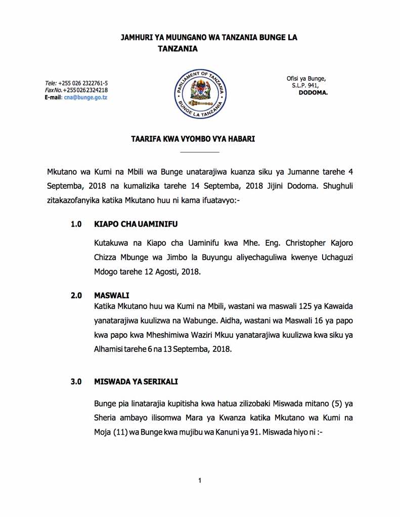 Taarifa iliyotolewa kwa vyombo vya habari jijini Dodoma na Kitengo cha Habari, Elimu kwa Umma na Mawasiliano cha Ofisi ya Bunge imesema kuwa shughuli nyingine itakayofanyika ni kula kiapo cha uaminifu kwa Mhandisi Christopher Chizza ambaye ni Mbunge wa jimbo la Buyungu mkoani Kigoma aliyechaguliwa katika uchaguzi mdogo wa ubunge uliofanyika Agosti 12 mwaka 2018.