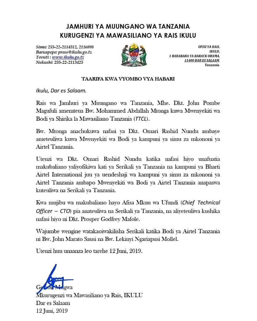 Wajumbe wengine watakaoiwakilisha Serikali katika Bodi ya Airtel Tanzania ni John Sausi na Lekinyi Mollel.