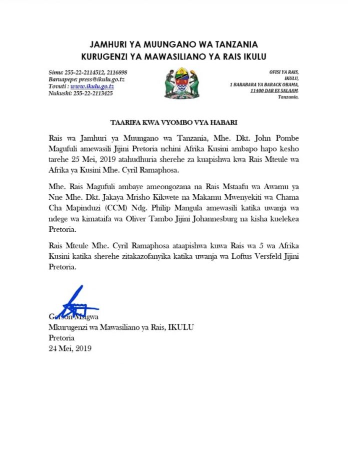 Rais wa John Magufuli amewasili jijini Pretoria nchini Afrika Kusini ambapo hapo kesho atahudhuria sherehe za kuapishwa kwa Rais Mteule wa nchi hiyo Cyril Ramaphosa.