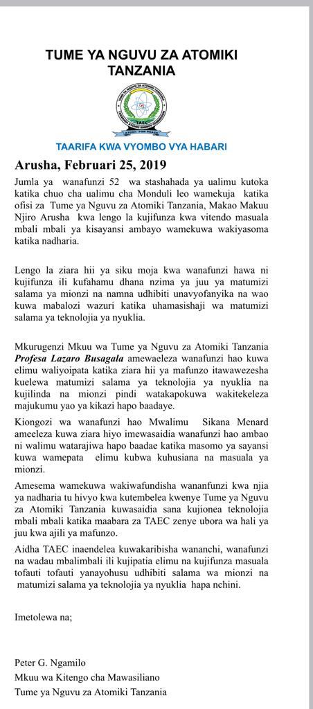 Mkurugenzi Mkuu wa Tume ya Nguvu za Atomiki Tanzania Profesa Lazaro Busagala amewaambia Wanafunzi hao kuwa elimu waliyoipata itawawezesha kuelewa matumizi salama ya teknolojia ya nyuklia na kujilinda na mionzi pindi watakapokuwa wakitekeleza majukumu yao ya kikazi hapo baadaye.