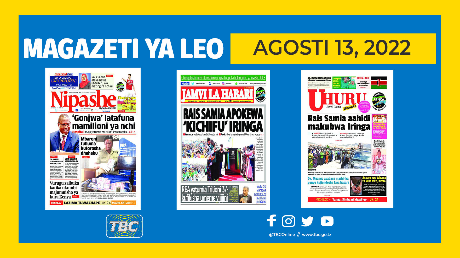 KimataifaKitaifa Yaliyomo kwenye kurasa za magazeti ya Agosti 13, 2022 By Judith Ene Laizer - August 13, 2022 0 282 Share FacebookTwitterWhatsAppLinkedin