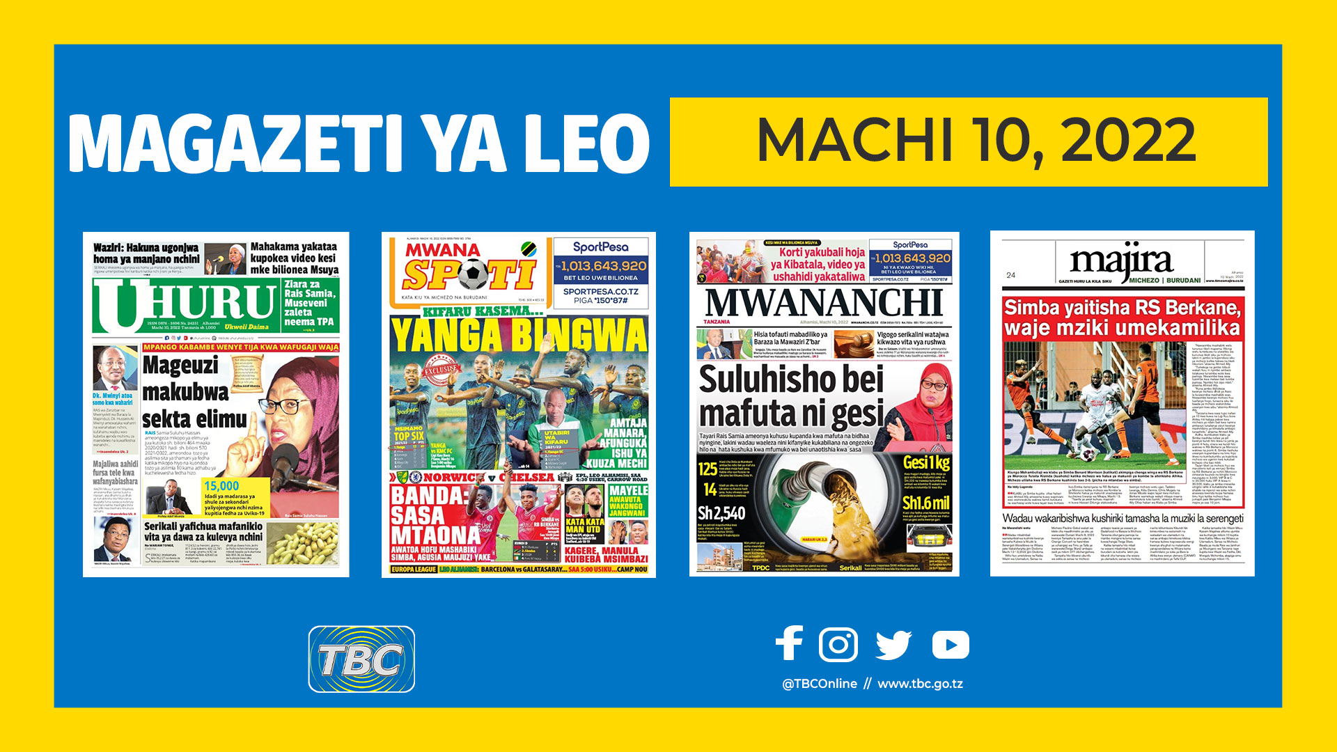 KURASA ZA MAGAZETI Yaliyomo ndani ya kurasa za magazeti ya leo Machi 10, 2022 By TBC - March 10, 2022 0 668 Share FacebookTwitterWhatsAppLinkedin